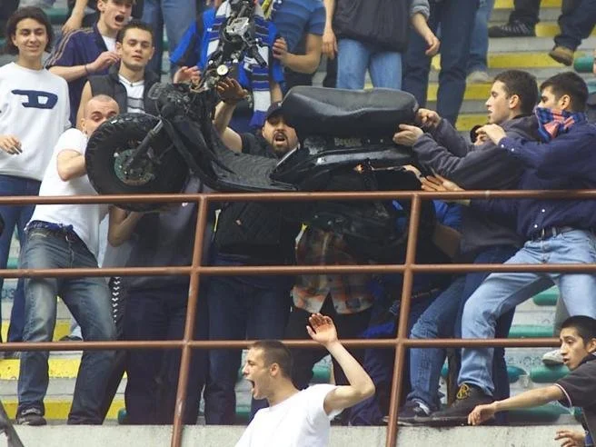 Fortunately, the moped did not make it onto the pitch, however. Initially, the Vespa was seen on the second tier. Inter fans proceeded to throw the moped over the railings, luckily into an empty section below.